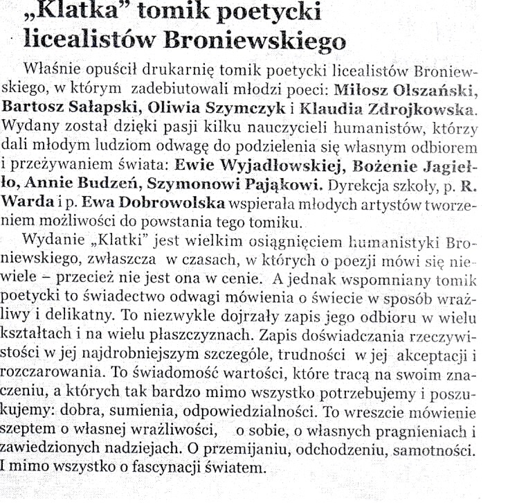,,KLATKA'' TOMIK POETYCKI LICEALISTÓW BRONIEWSKIEGO
